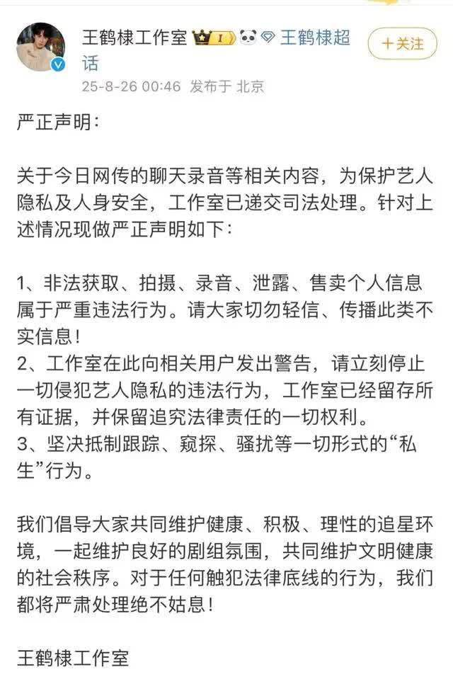 8月26日凌晨,王鹤棣工作室发布严正声明提到,“网传的聊天录音等相关内容,为保护艺人隐私及人身安全,工作室已递交司法处理。”